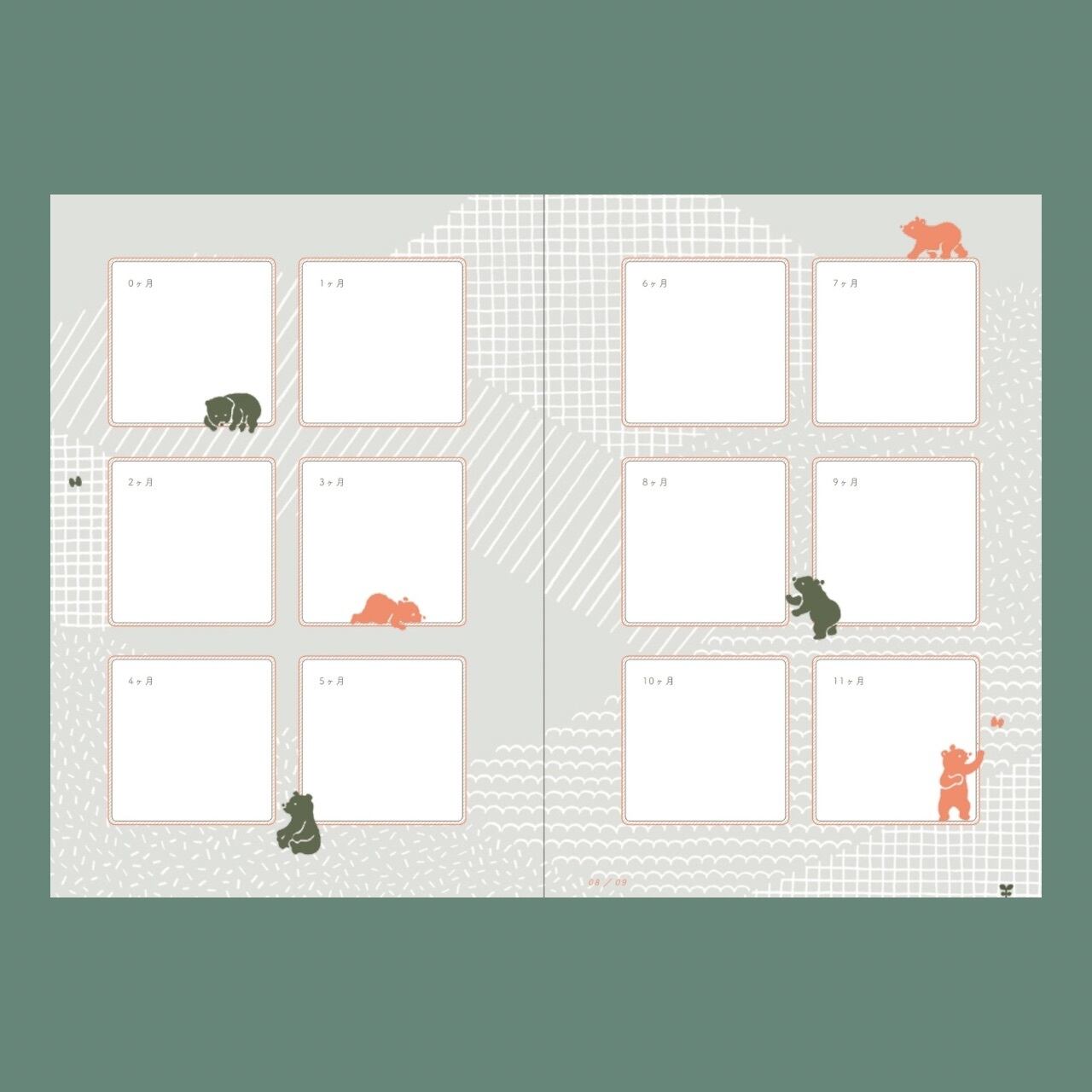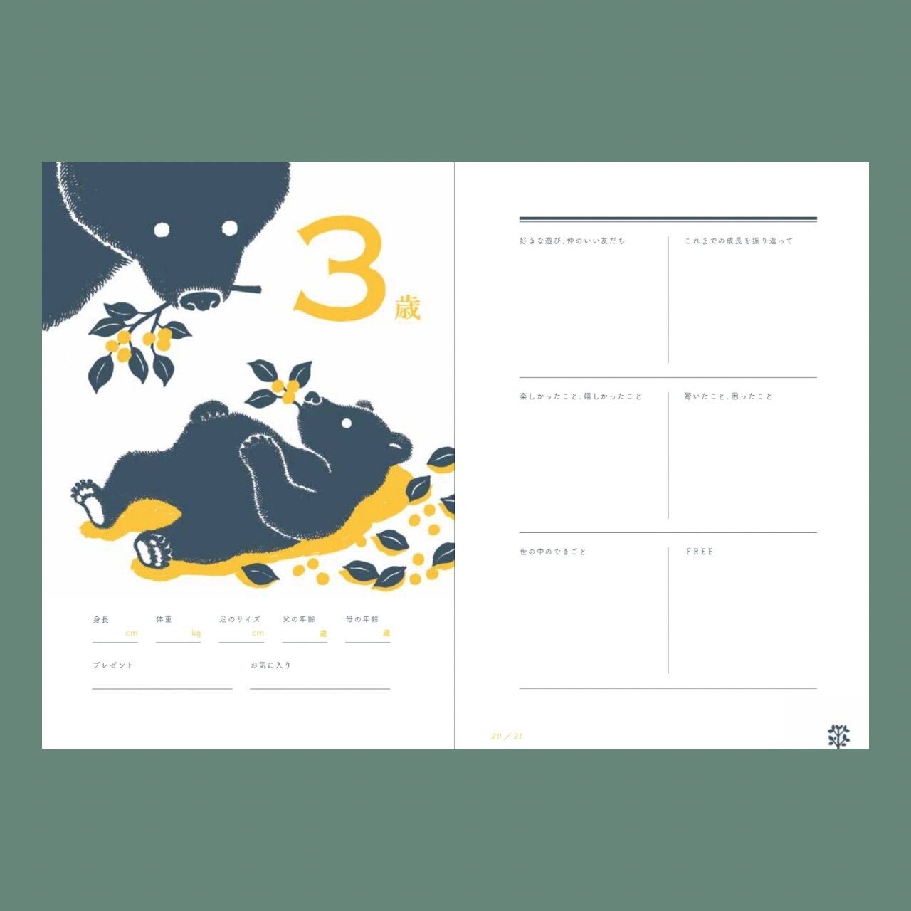 0歳は月ごとに、1歳からはお誕生日ごとに記録します。各年齢ページの次にあるフリースペースには、思い出の写真やチケット、手形や足形、お子さんが描いた絵などを自由に貼っていただけます。